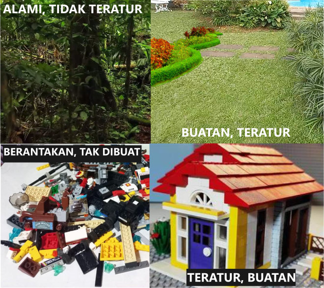 Perbedaan Yang Mencolok, Rapi & TeraturAntara sesuatu yang dibuat sengaja, dengan sesuatu yang terjadi alami, ada perbedaan terkait kerapian dan keteraturan. Ini logika sederhana.Saat memasuki hutan belantara, terlihat pohon tumbuh tak beraturan, akar dan dedaunan tampak tumpang tindih. Namun, bagaimana bila di dalam hutan kita menemukan area yang rapi teratur? Sangat berbeda dengan area lain. Tanaman tertata, ada tempat istirahat, penampungan air, tempat bersih-bersih dan hal lainnya yang rapi teratur? Secara logika sederhana dan dalam kasus di dunia, tentu ada orang yang membuat dan mengaturnya.