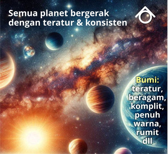 Begitupula dalam Tata Surya, hanya bumi lah yang teratur secara detil dan rumit sedemikian rupa, ada makhluk hidup dan berbagai benda beraneka jenis, bentuk, warna dan fungsi yang saling melengkapi, berbeda sekali dibandingkan planet lain. Dalam logika sederhana, ada Pencipta yang khusus membuat itu. |